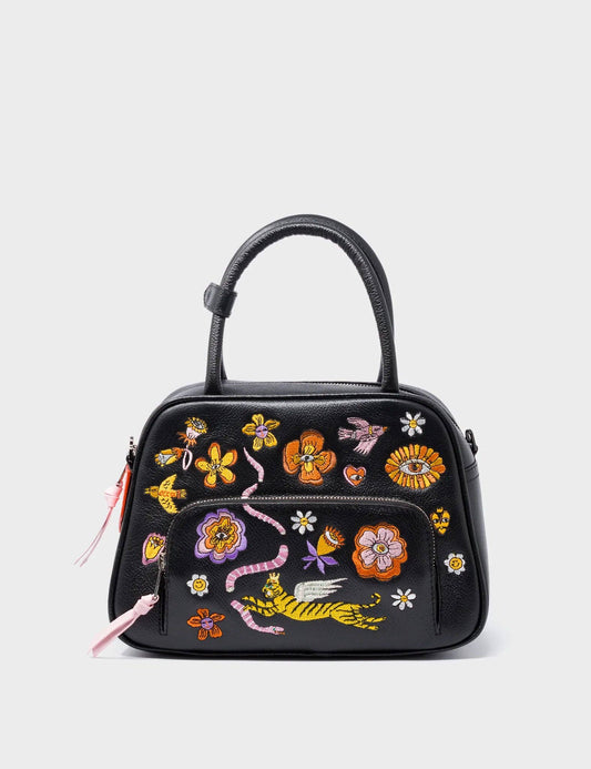 Marino Medium Crossbody Black Leather Bag - Vintage Bloom Embroidery