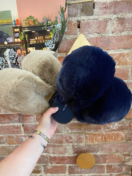 Snowball Slipper in Taupe Faux Fur and Navy Faux Fur