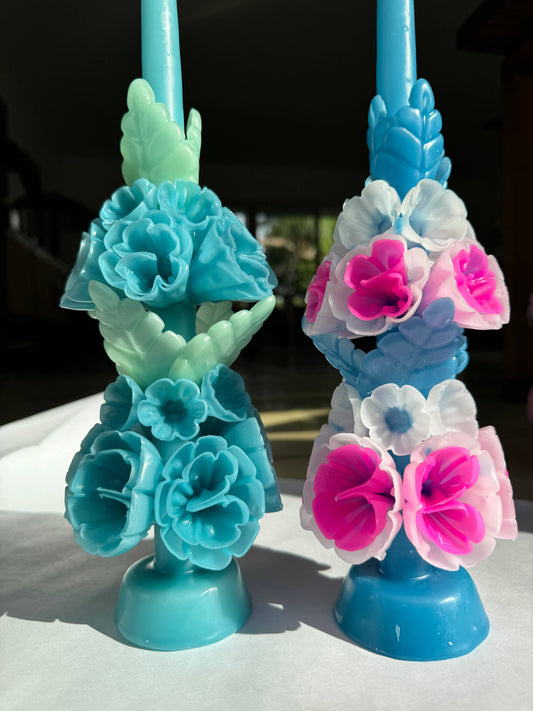 Tall Mexican Floral Candle- Shallow + Deep Blues