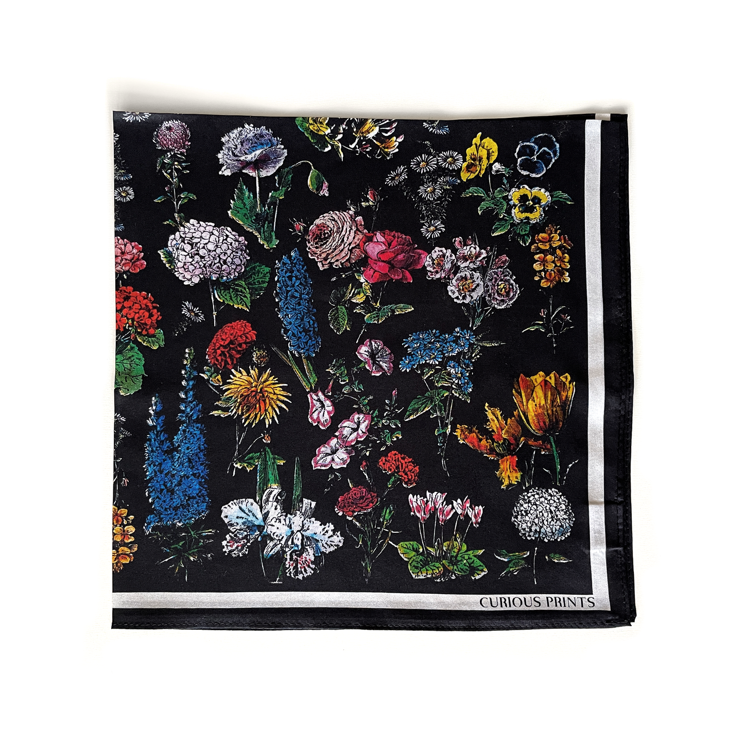 100% Silk Scarf Botanical Black Floral Bandana 17x17