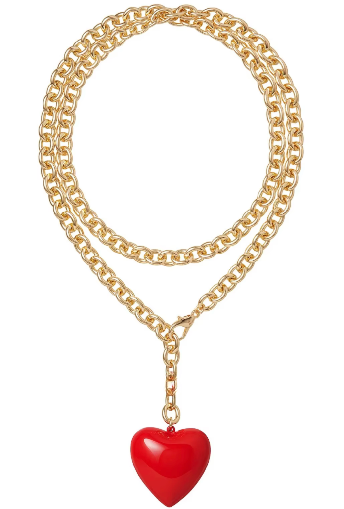 Amour is an extra long over sized Rolo Chain that can be worn wrapped or as a Lariat. The 1.5" Full enamel Heart makes a playful statement.