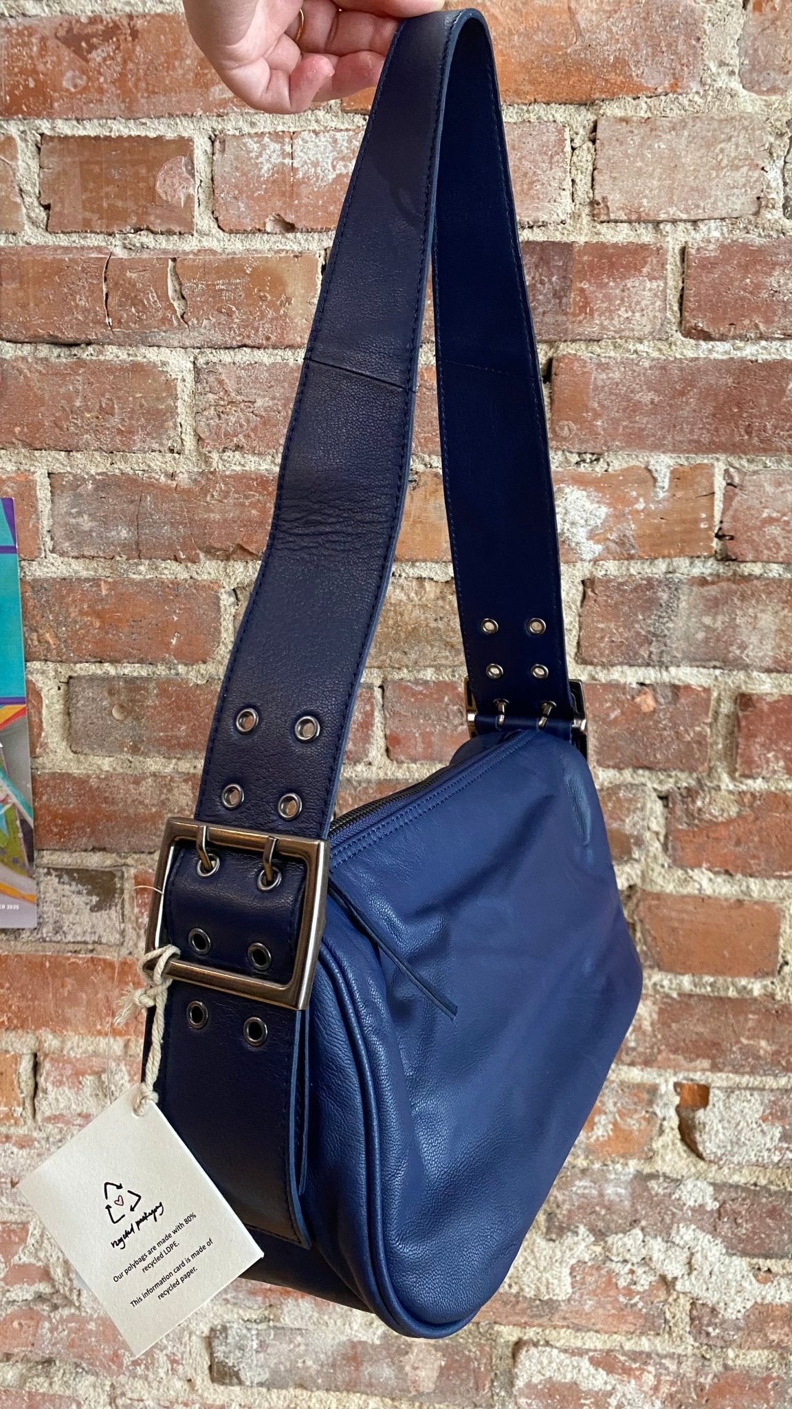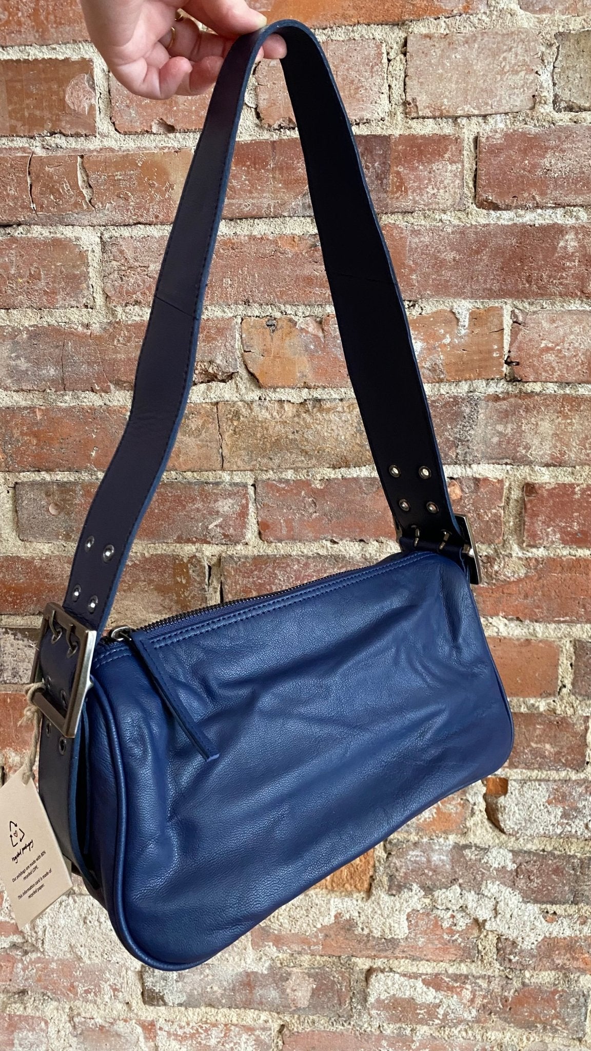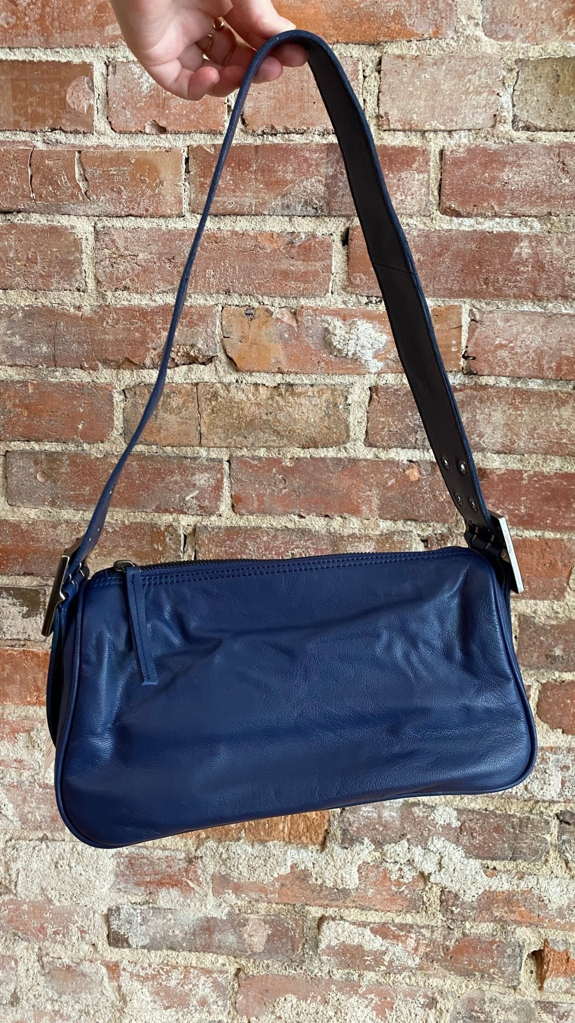 Features: Arm bag, leather fabrication, thick adjustable shoulder strap, zip top closure