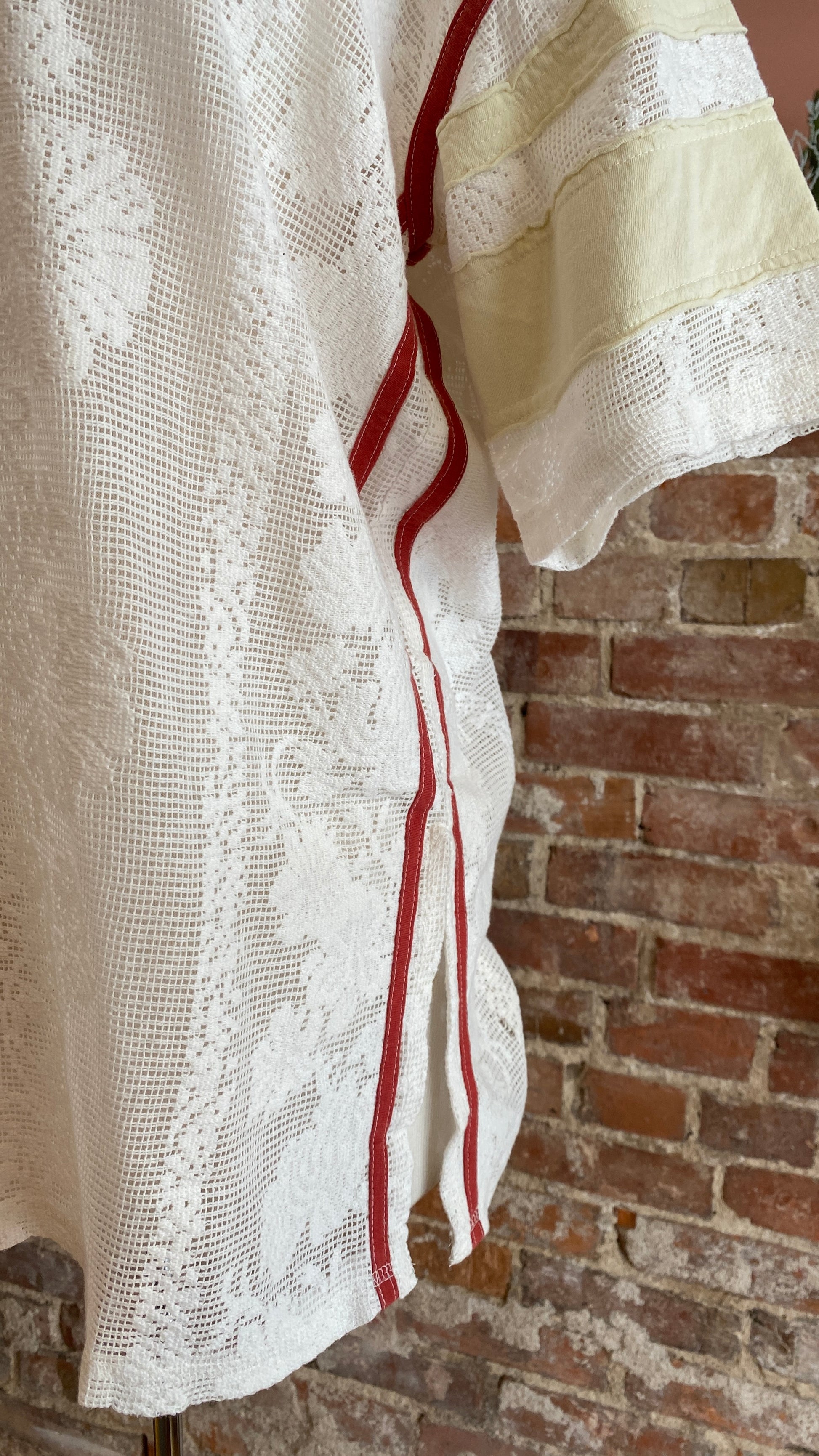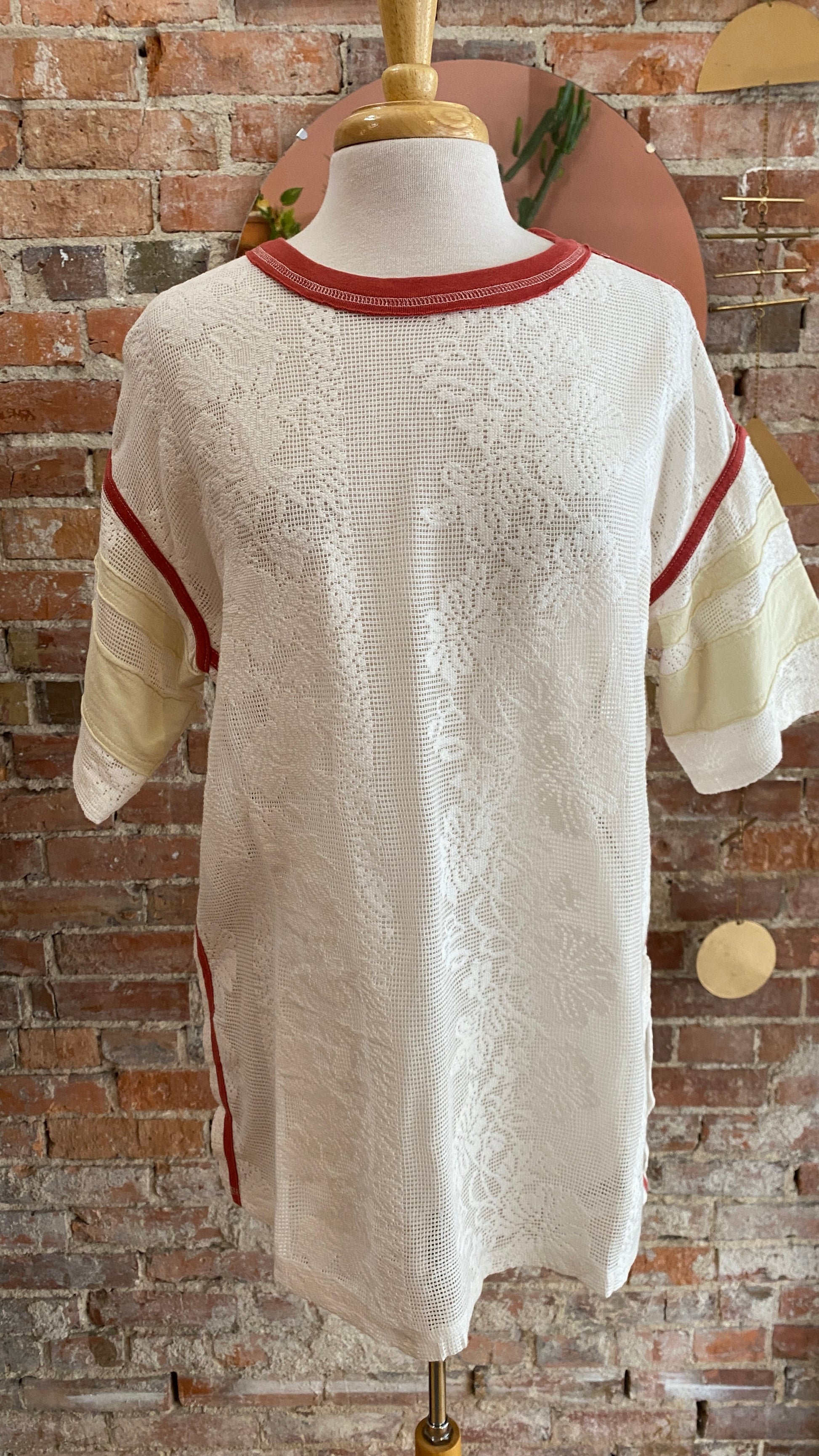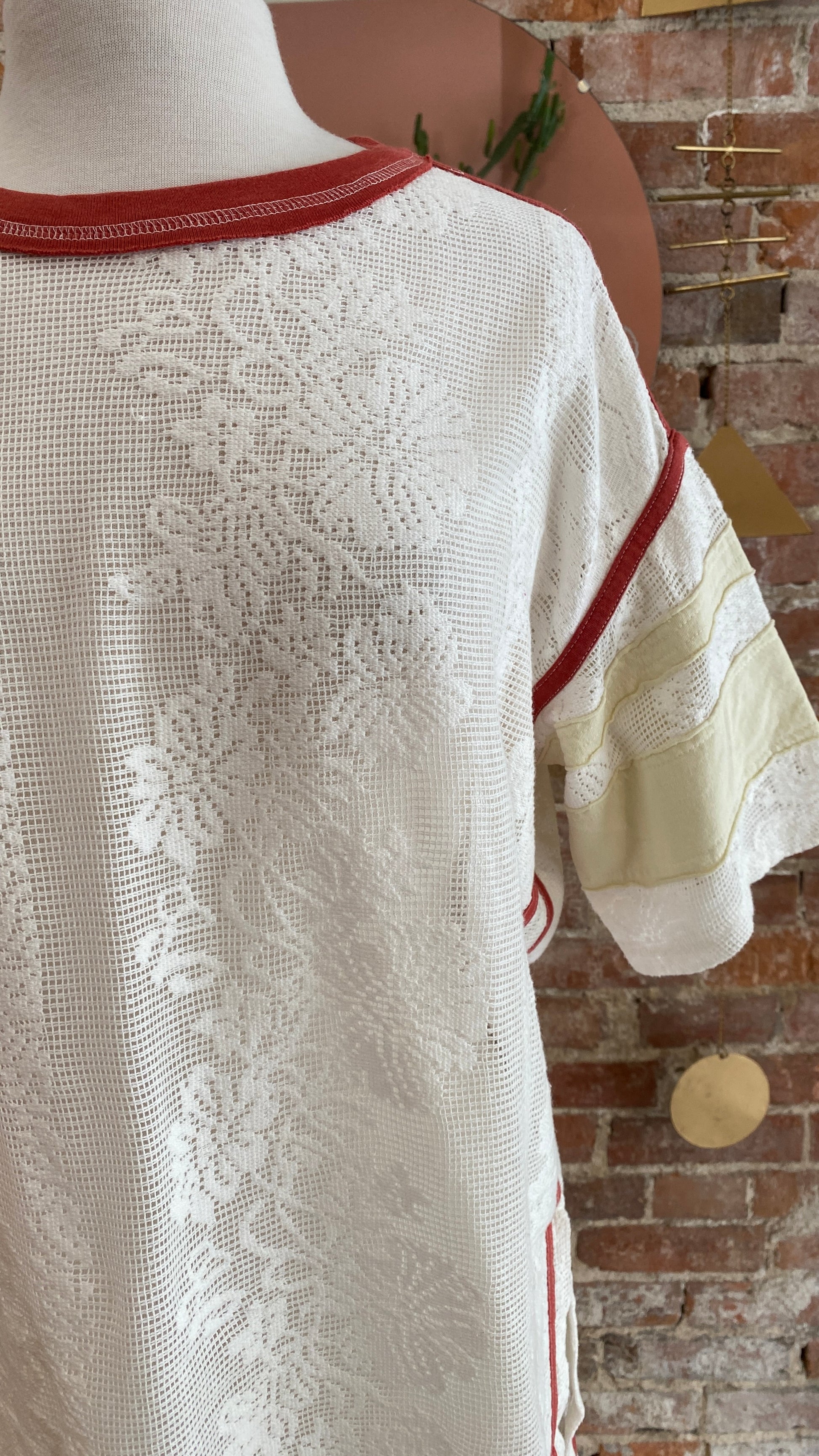 Sporty meets femme with this oversized, jersey-inspired tee from We The Free, featured in a full mesh lace fabrication with contrasting trim and varsity stripe accents.