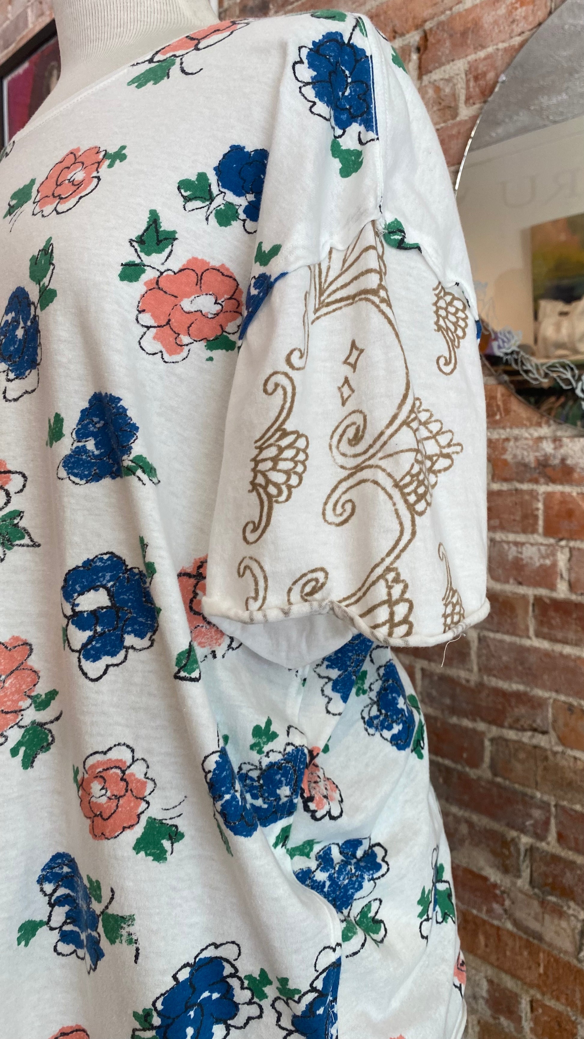Features: Soft fabrication, breezy design, scoop neckline, printed detailing, dropped sleeves, raw seam detailing