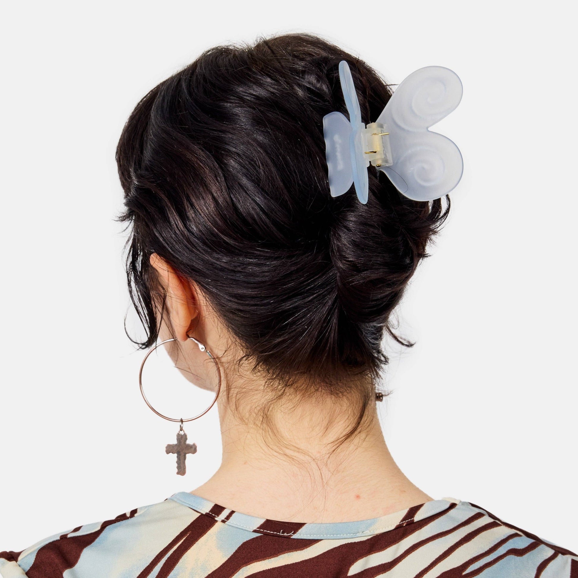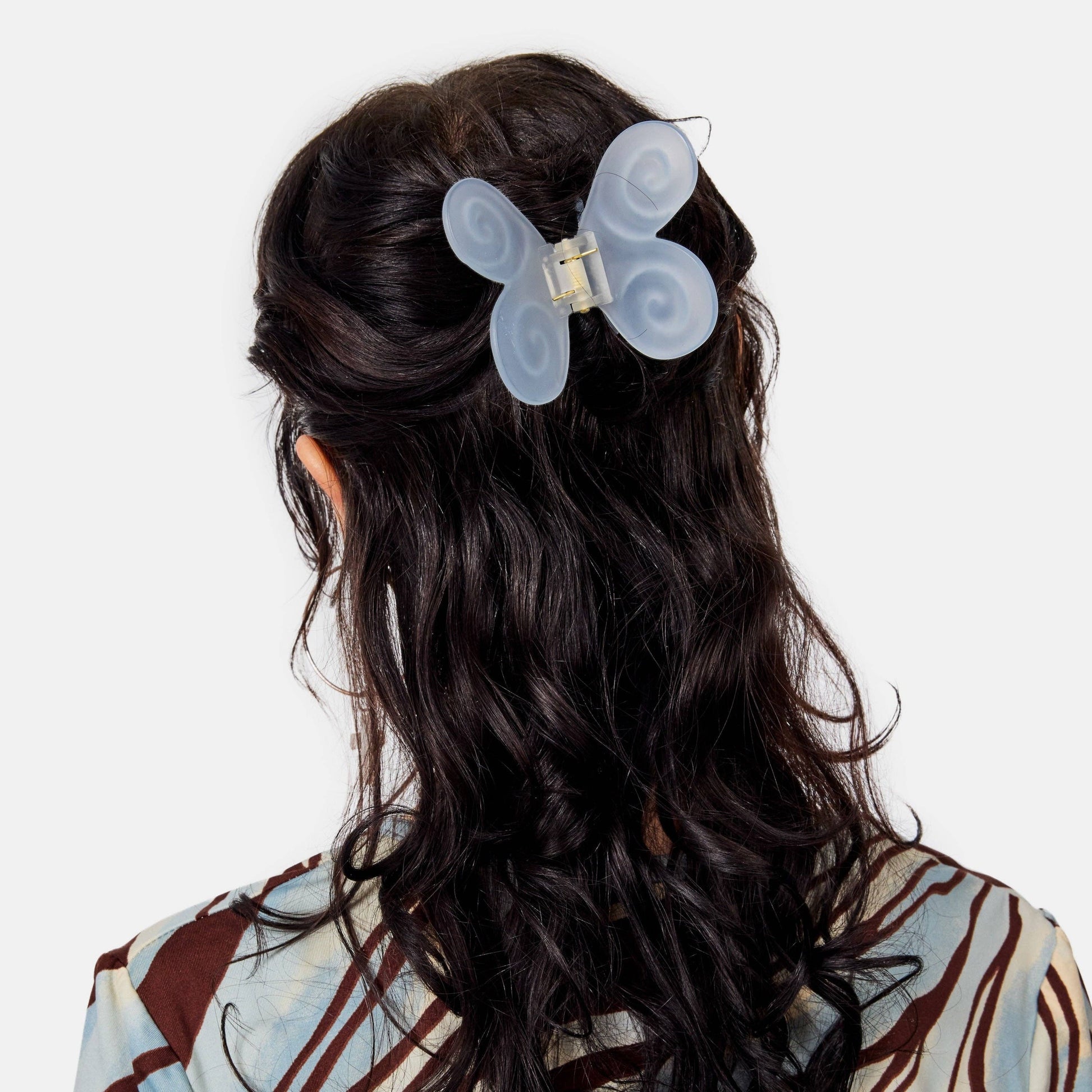 This medium sized hair claw features dreamy swirl butterfly wings and a soft matte finish. Provides a secure hold for thin to medium hair, perfect for quick French twists or effortless half-up styles for thicker hair.