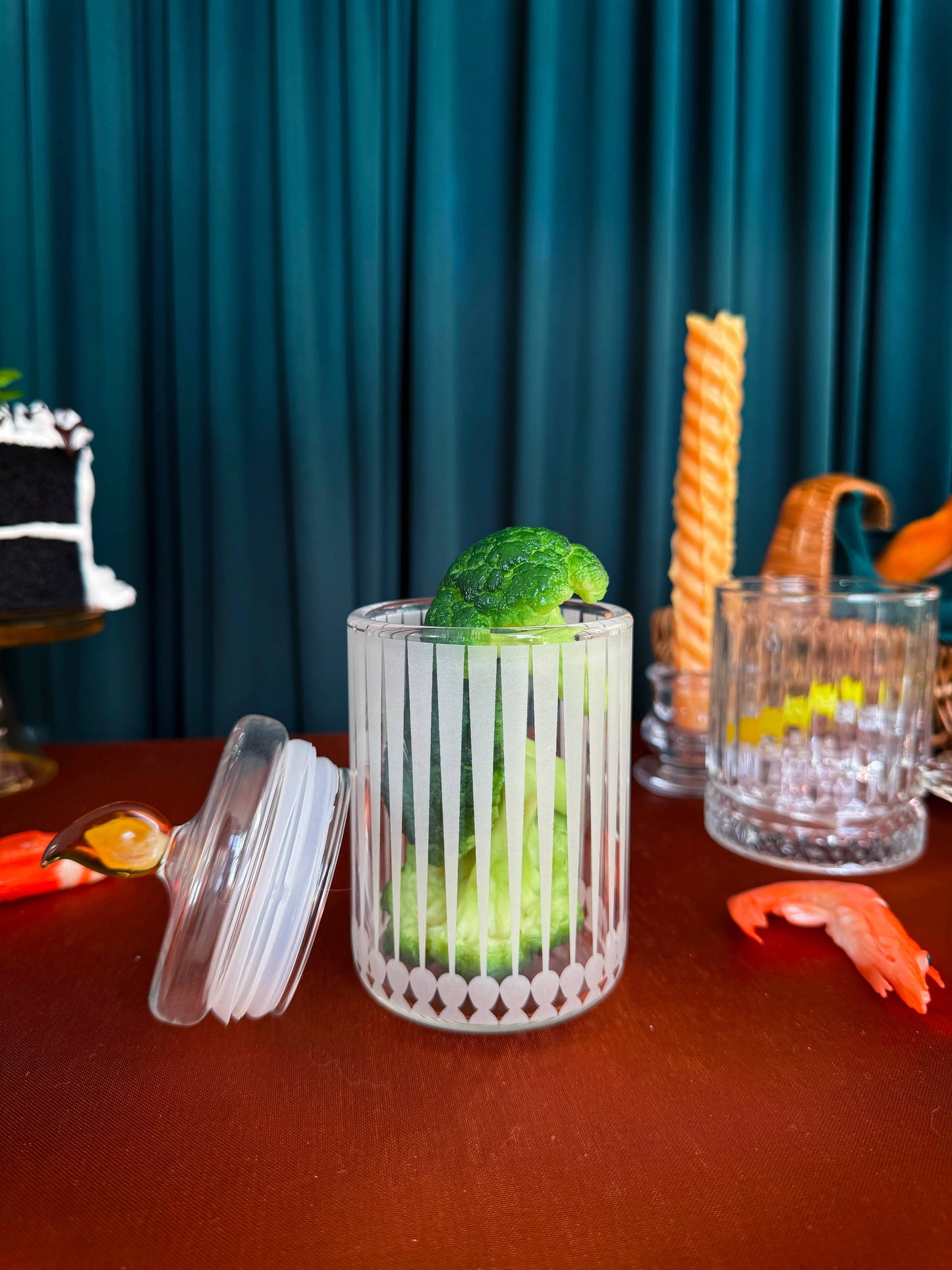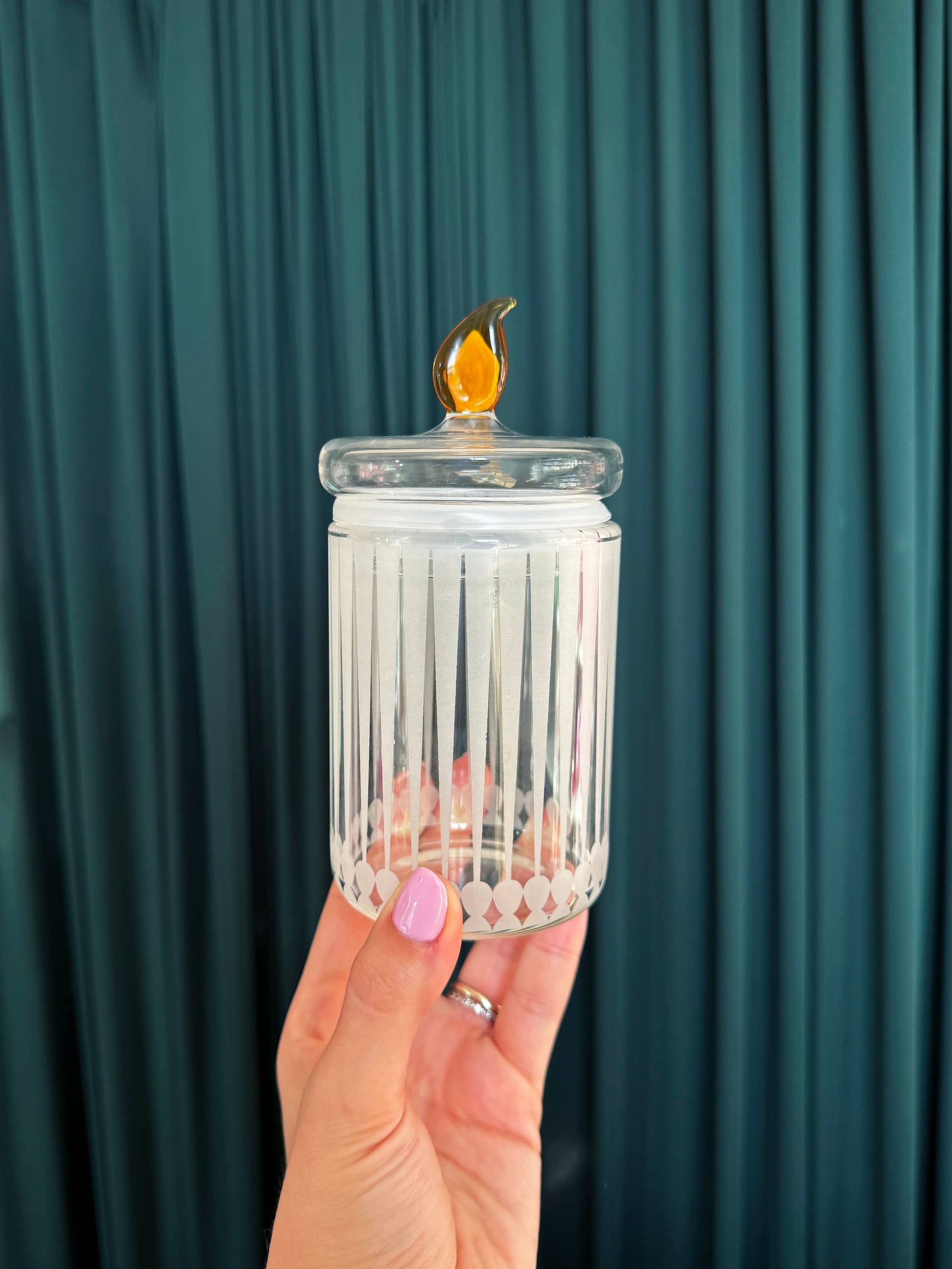This stunning piece makes us want to slip on a vintage nightgown, retreat to the drawing room, and savor a relaxing nightcap, so honk shoo! Features a gorgeous frosted glass etched design and a lid that resembles a flickering flame. Stunning! The lid seals tightly, keeping your stash fresh in style! Also looks cute as a storage jar for your kitchen, bathroom, bedroom, bar cart etc!
