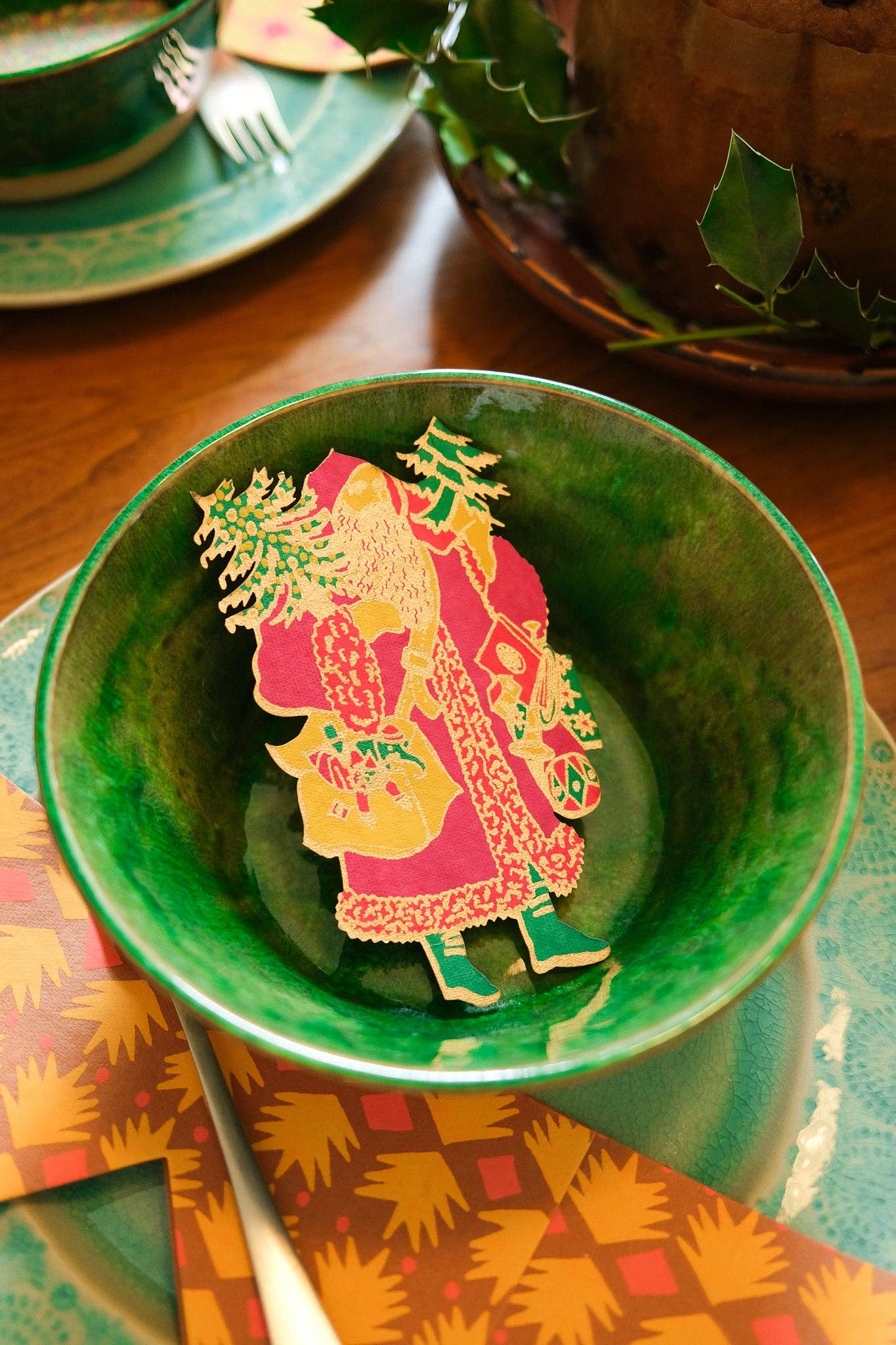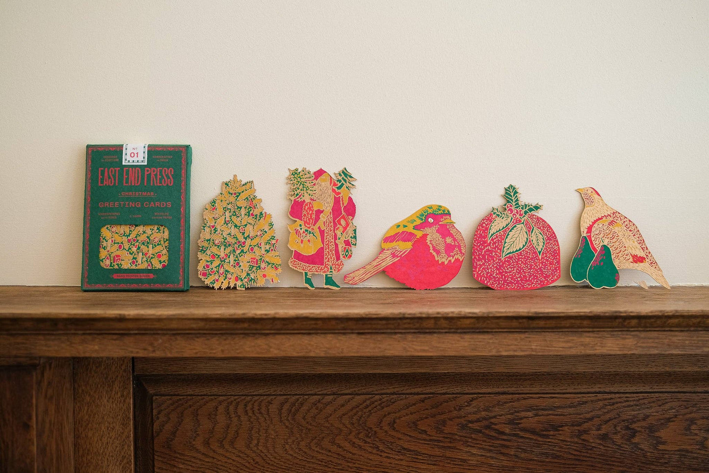 Beautifully screen-printed festive greeting cards, perfect for wishing loved ones a Merry Christmas. Includes a robin, tree, pudding, partridge, Saint Nicholas, and matching illustrated envelopes. Set of five designs with matching envelopes - Screen printed on both sides - Blank text panel on the reverse - Handmade by talented artisans in Jaipur - Sustainably made from recycled materials