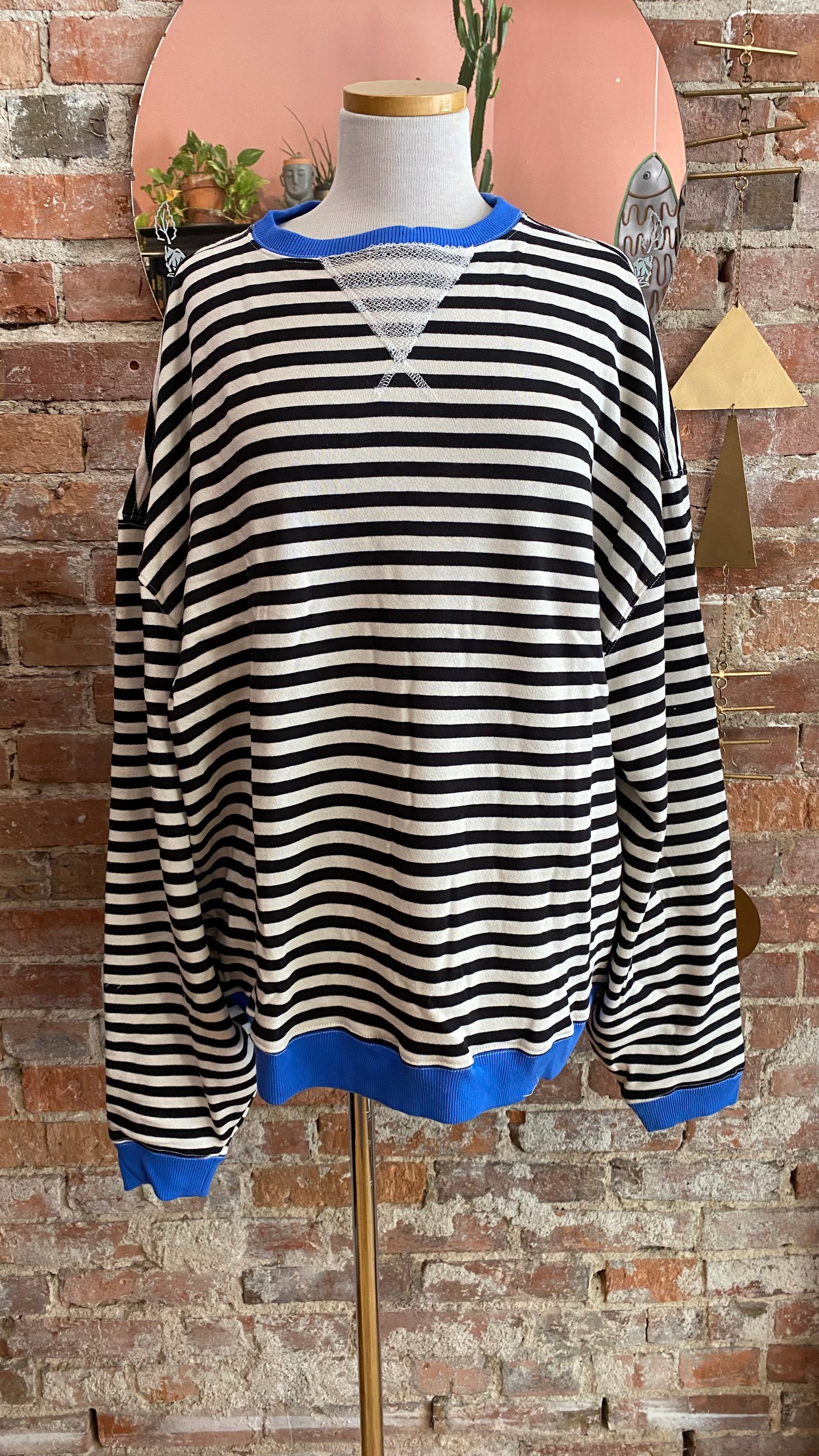 So cool and classic, this timeless crewneck is featured in an oversized, slouchy silhouette and staple striped print with contrasting hems for added dimension.