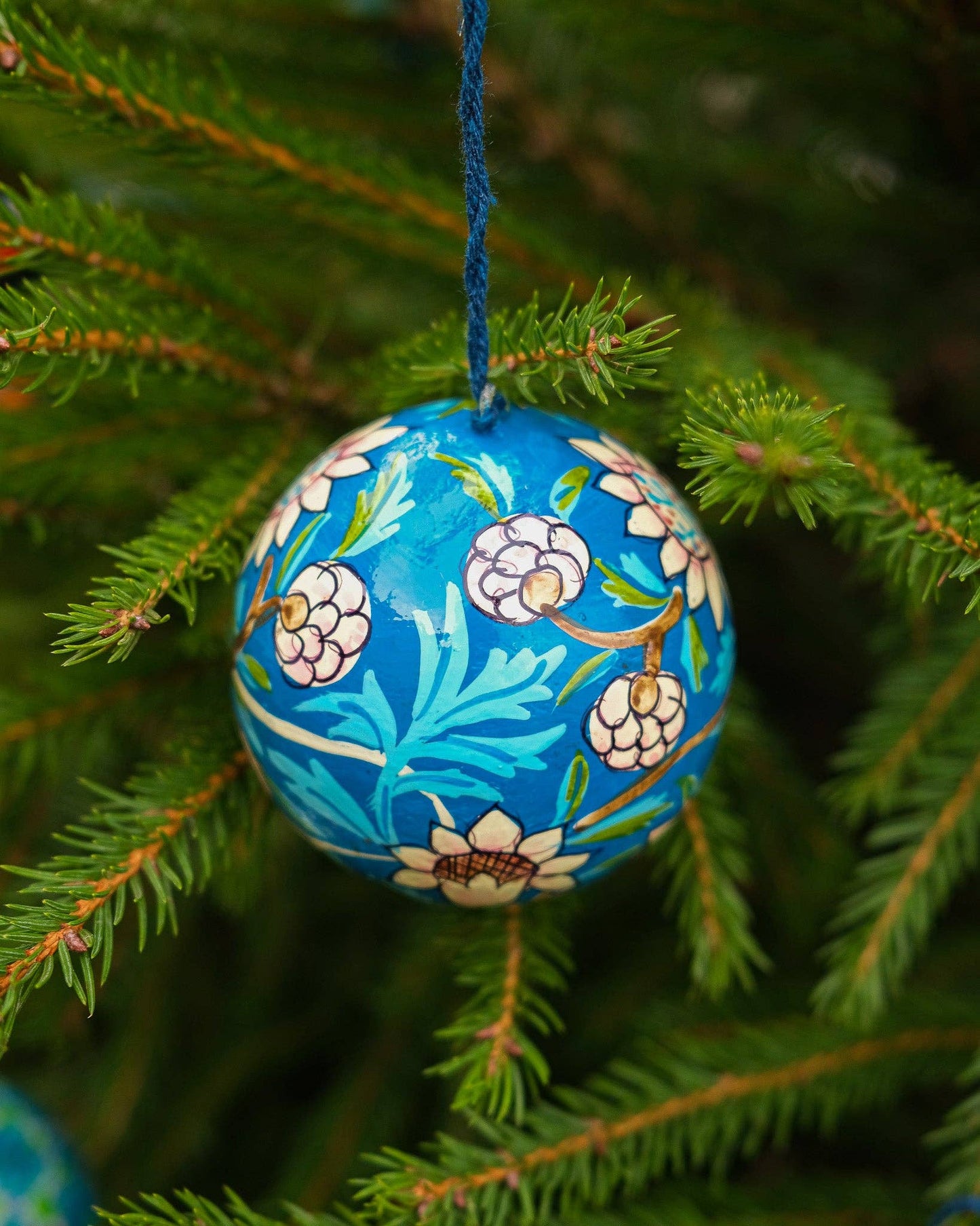 These beautiful baubles are all made from papier mâché recycled paper, hand-painted with intricate, colourful designs, and have a soft cotton thread hanging loop.