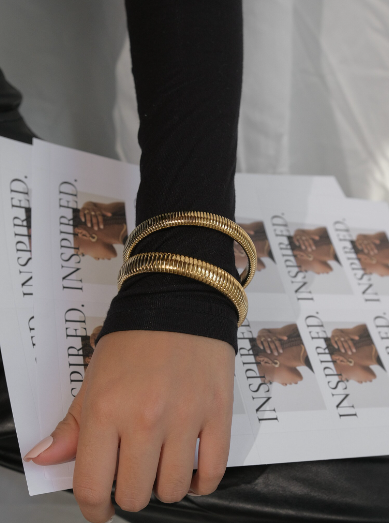 The Cobra Bangle is no exception. We are so excited to make this our way. Steel That is PVC plated for years of wear without tarnish. Then spring coiled to be the perfect flex bangle. This gently stretches to fit over your hand then settles perfectly and very softly on the wrist allowing all day wear.