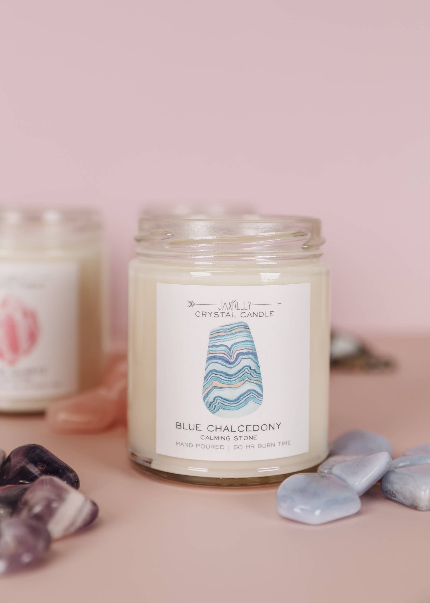 Nestled on top is a Blue Chalcedony that radiates calming energy. Once your candle has burned, retrieve your tumbled stone and carry it with you, or place it in a special space to manifest feelings of serenity.