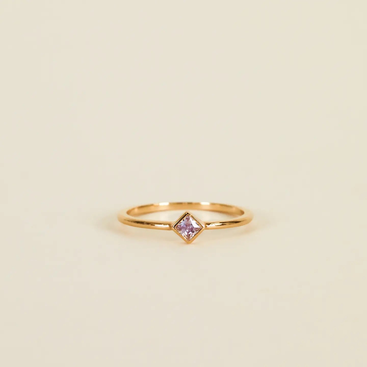 Lavender Cubic Zirconia 18kt gold over brass Band width approx 1mm Setting approx 3mm Sizes 6, 7, 8
