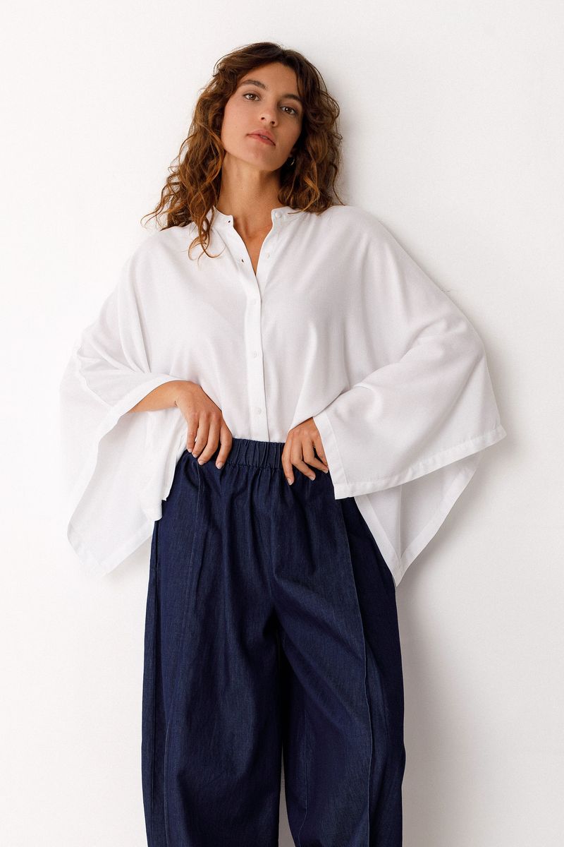 Oversized shirt with Mandarin collar and 3/4-length kimono sleeves. Button closure at the front.