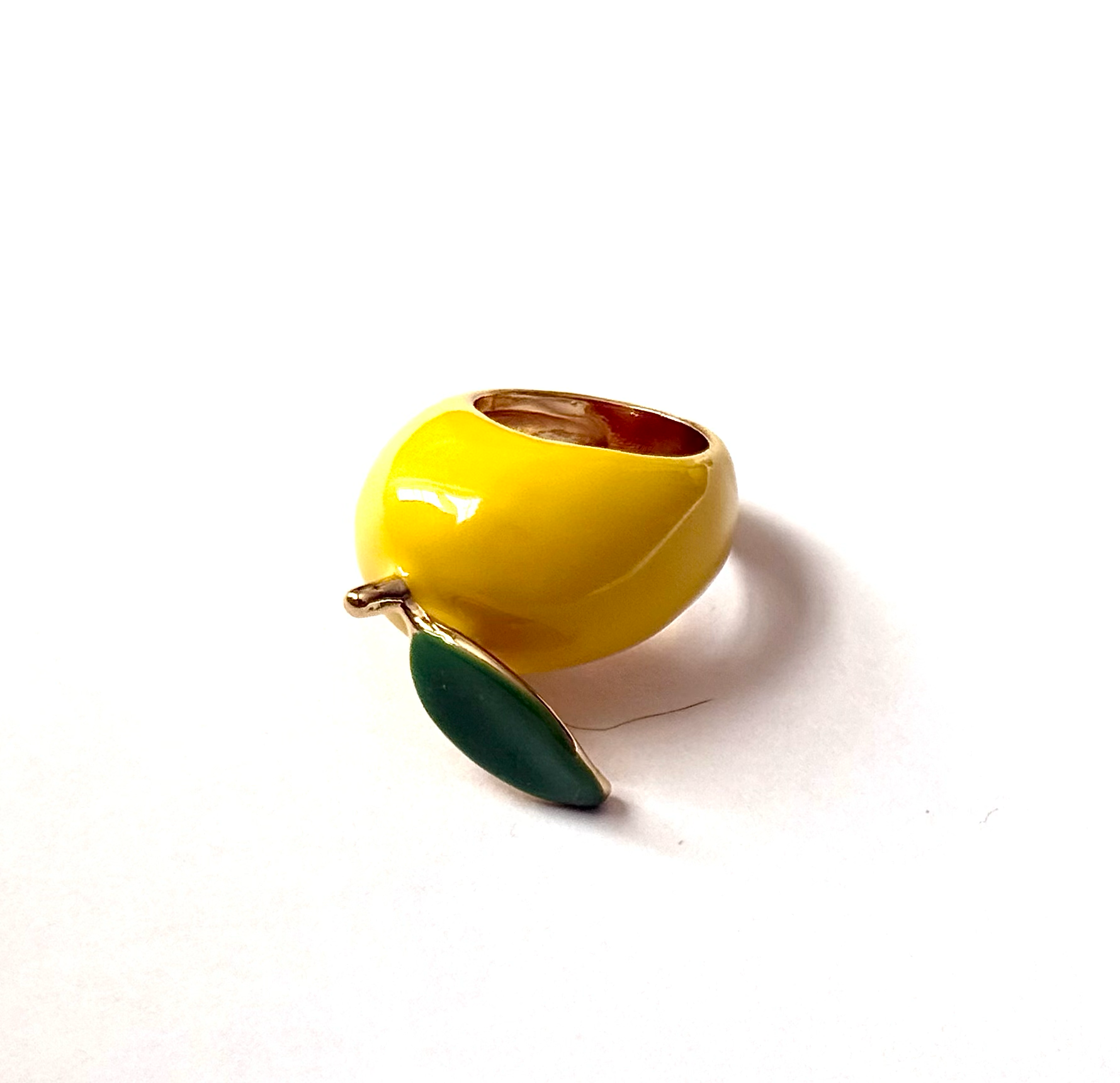 Fruit Basket is Fun and colourful and Whimsy. These are statement rings. Large profile- like our Dome. Tapered Band. Hand Enamelled and Gold plated and Electro Plated to avoid Tarnish. Not Waterproof. But very long lasting. These are each hand enamelled and therefore ob of a kind. The Strawberries fit size 7 and Apple and Lemons fit 6.