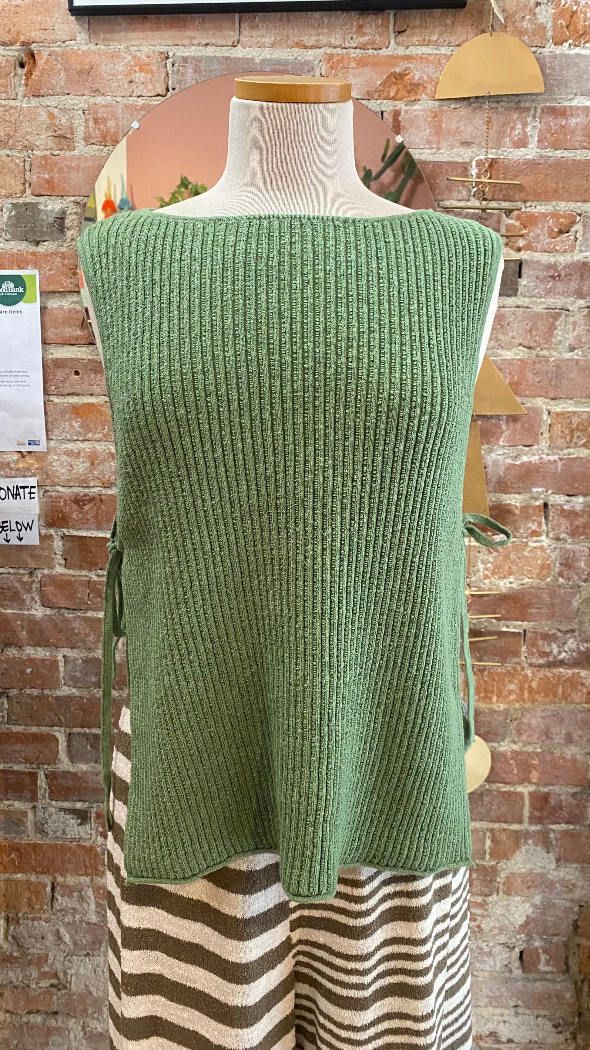 Features: Scoop neckline, ribbed knit fabrication, dropped armholes, side tie closures