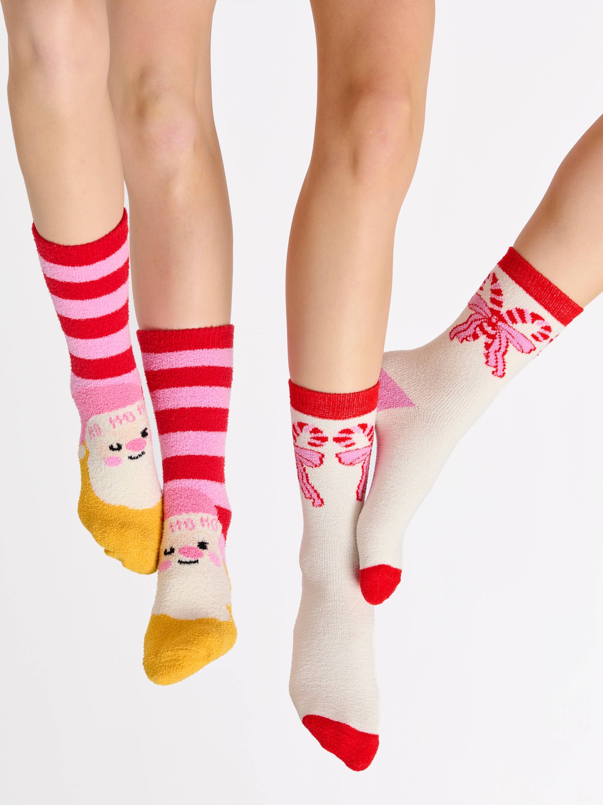 Fits size 5-18Made from polyester and spandex, Get into the holiday spirit from the toes up with these cheerful Santa Socks. Featuring jolly Santa faces at the toes and bold red-and-pink stripes up the calf, these socks are pure festive fun. A cozy yellow heel and toe add a warm pop of contrast, making these socks as bright as the season. Whether you’re wrapping gifts or sipping cocoa, these fuzzy socks will keep you comfy and smiling.