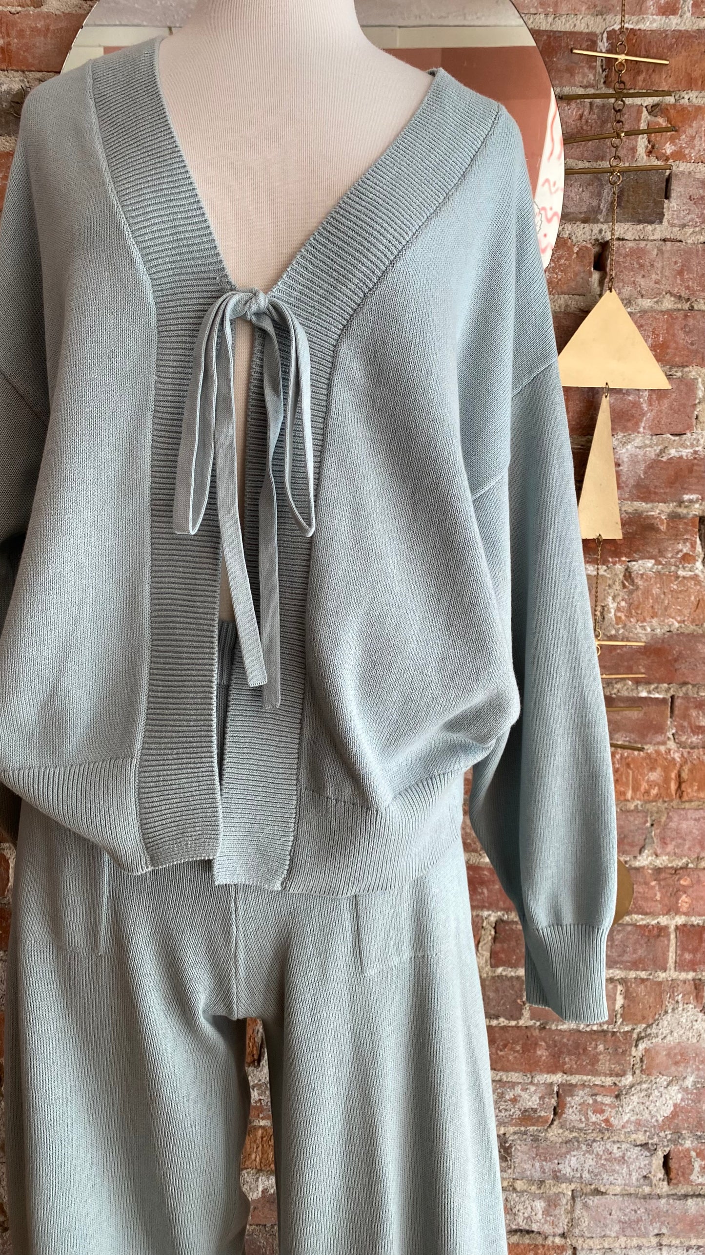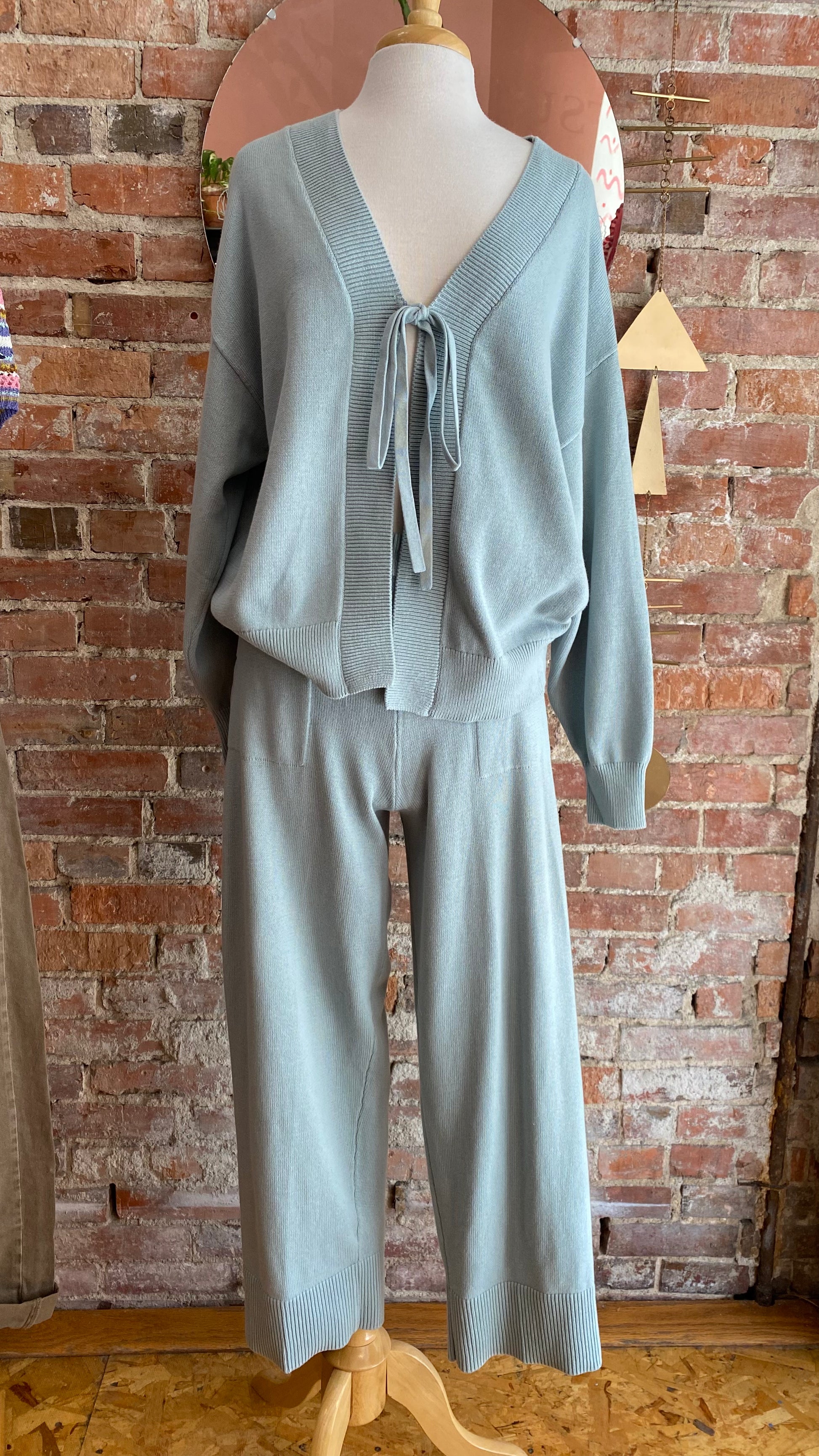 Fit: Sweater: Relaxed, slightly oversized fit; Pants: Relaxed, straight-leg fit that sits at the natural waist Features: Sweater: Open-front style with tie closure, dropped armholes, cozy knit fabrication; Pants: Pull-on waistband, side pockets, coordinating fabrication