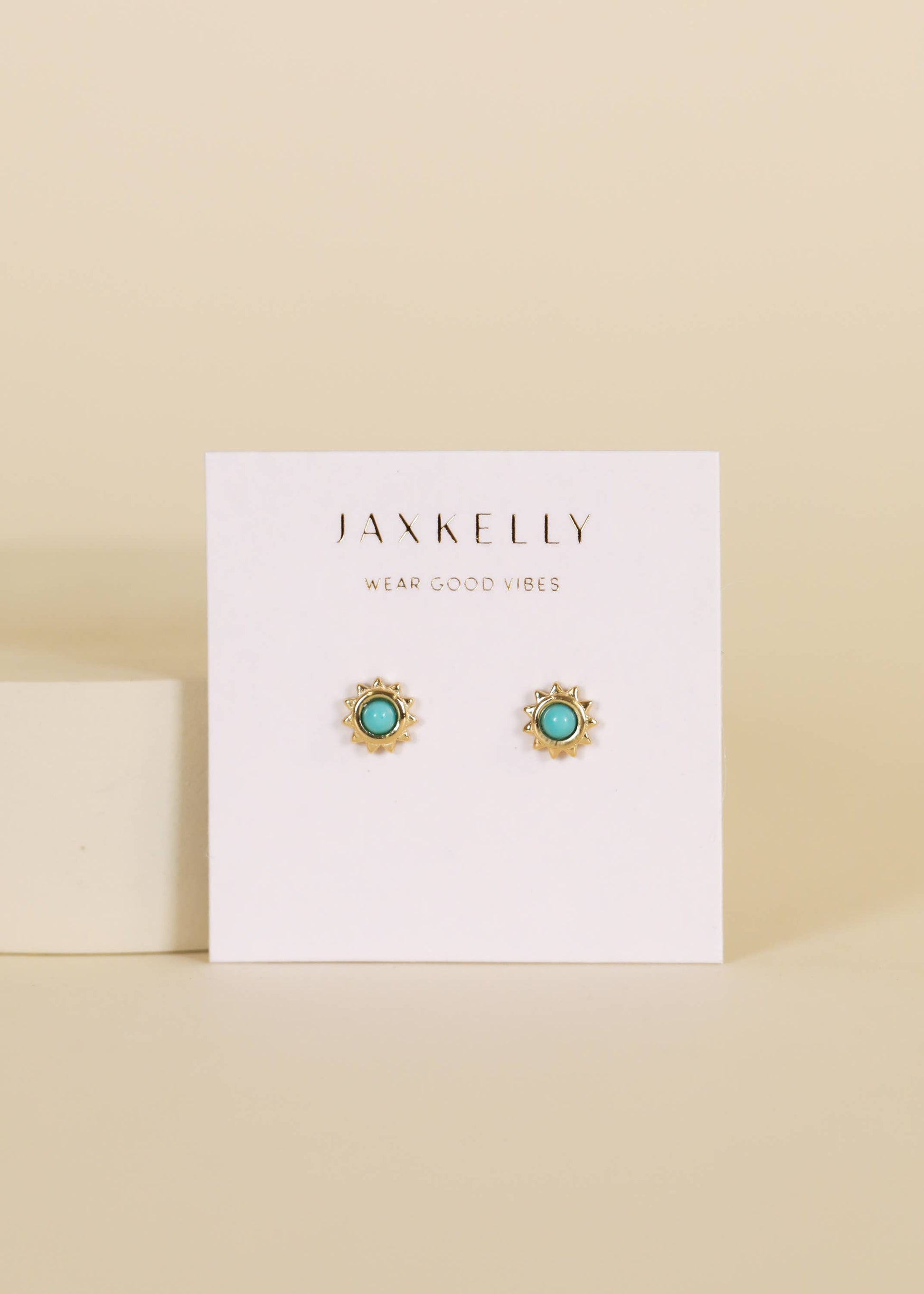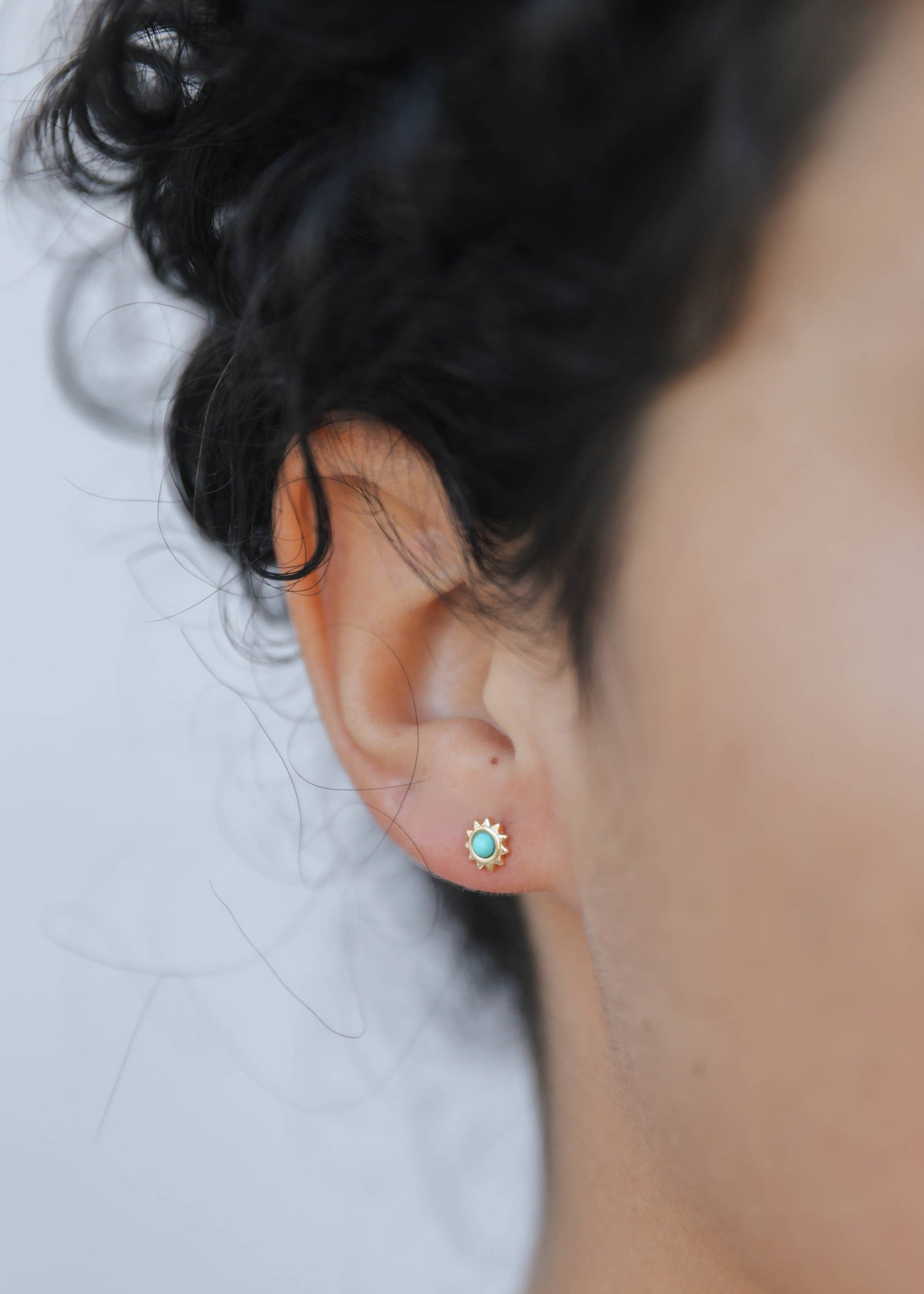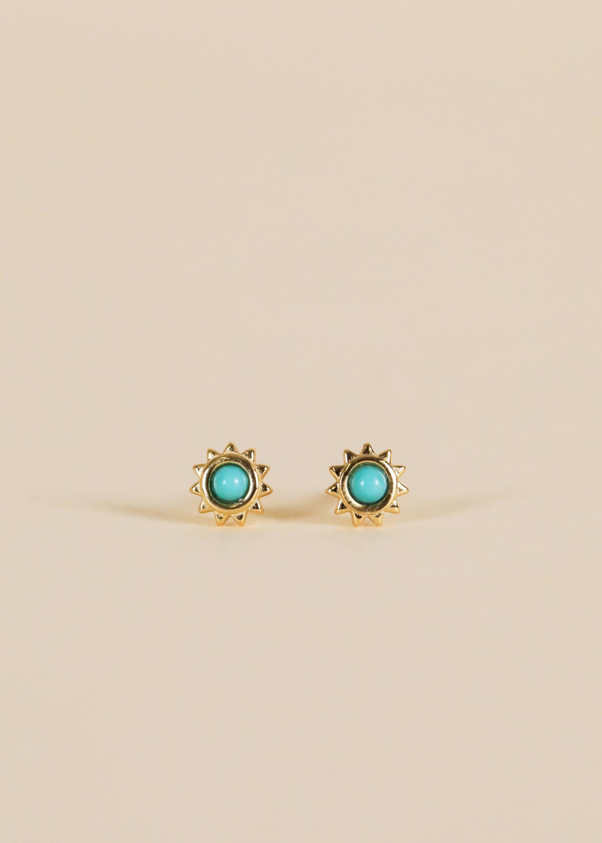 A gold sun featuring a petite polished Turquoise stone in the center.