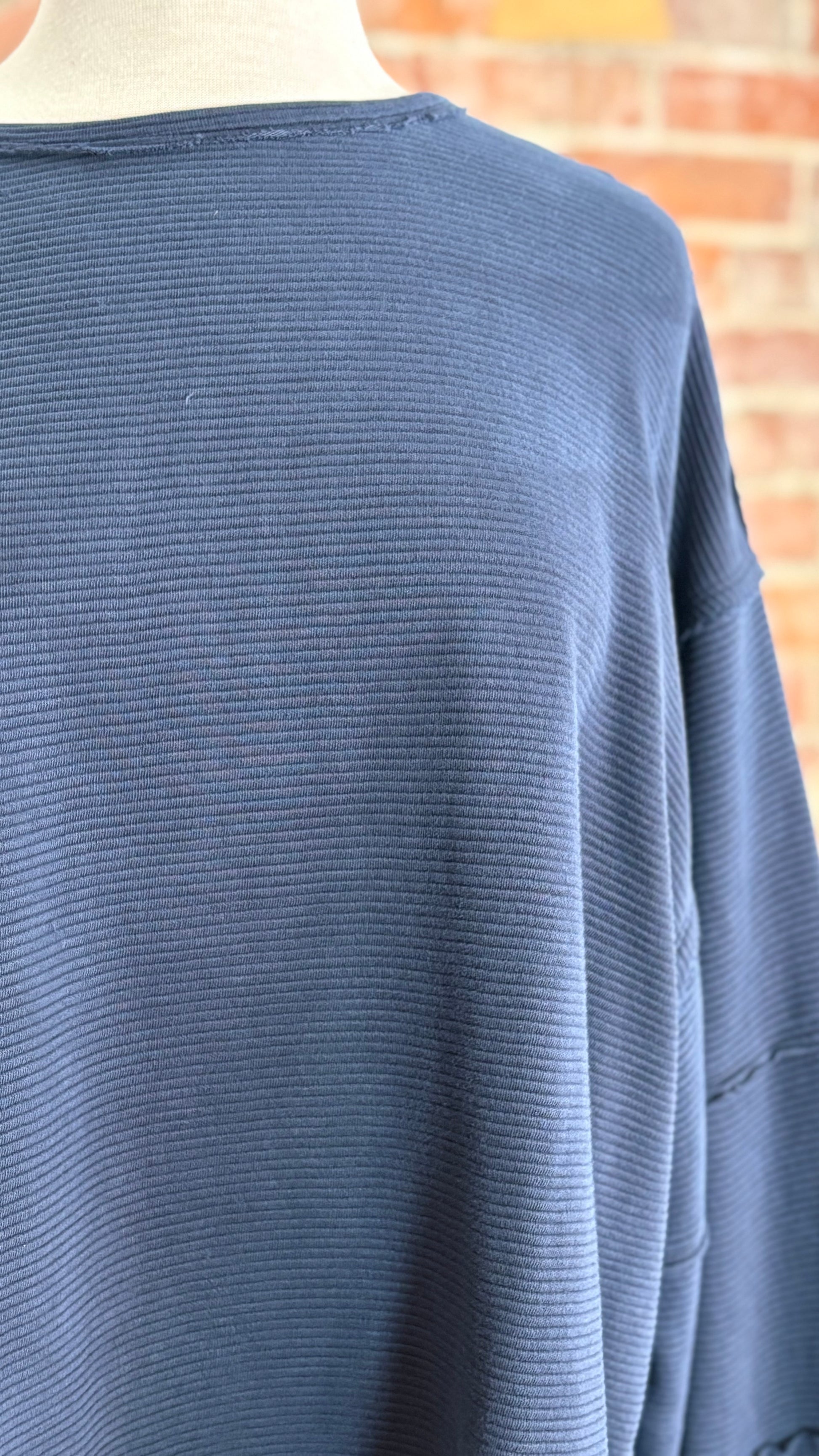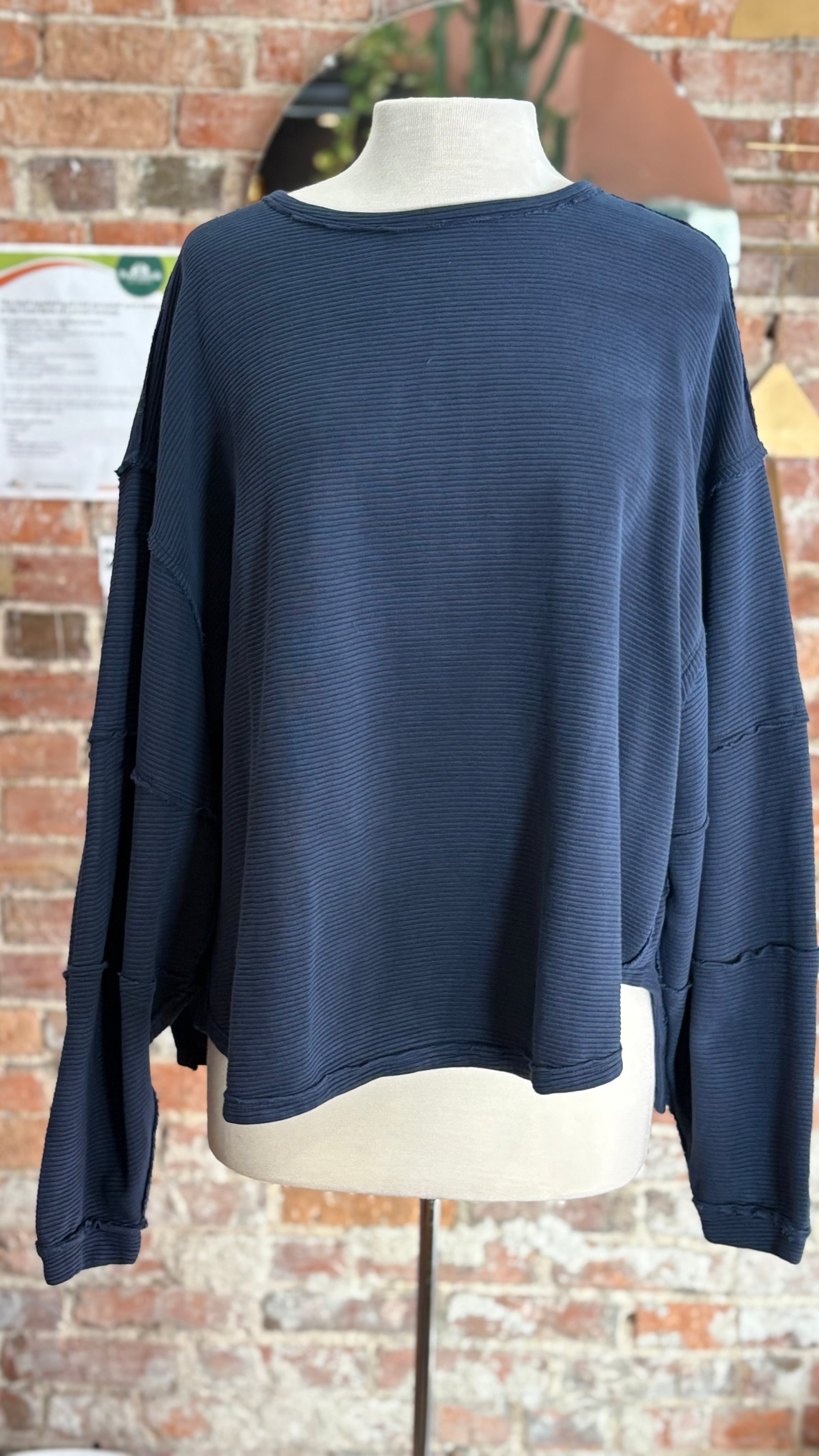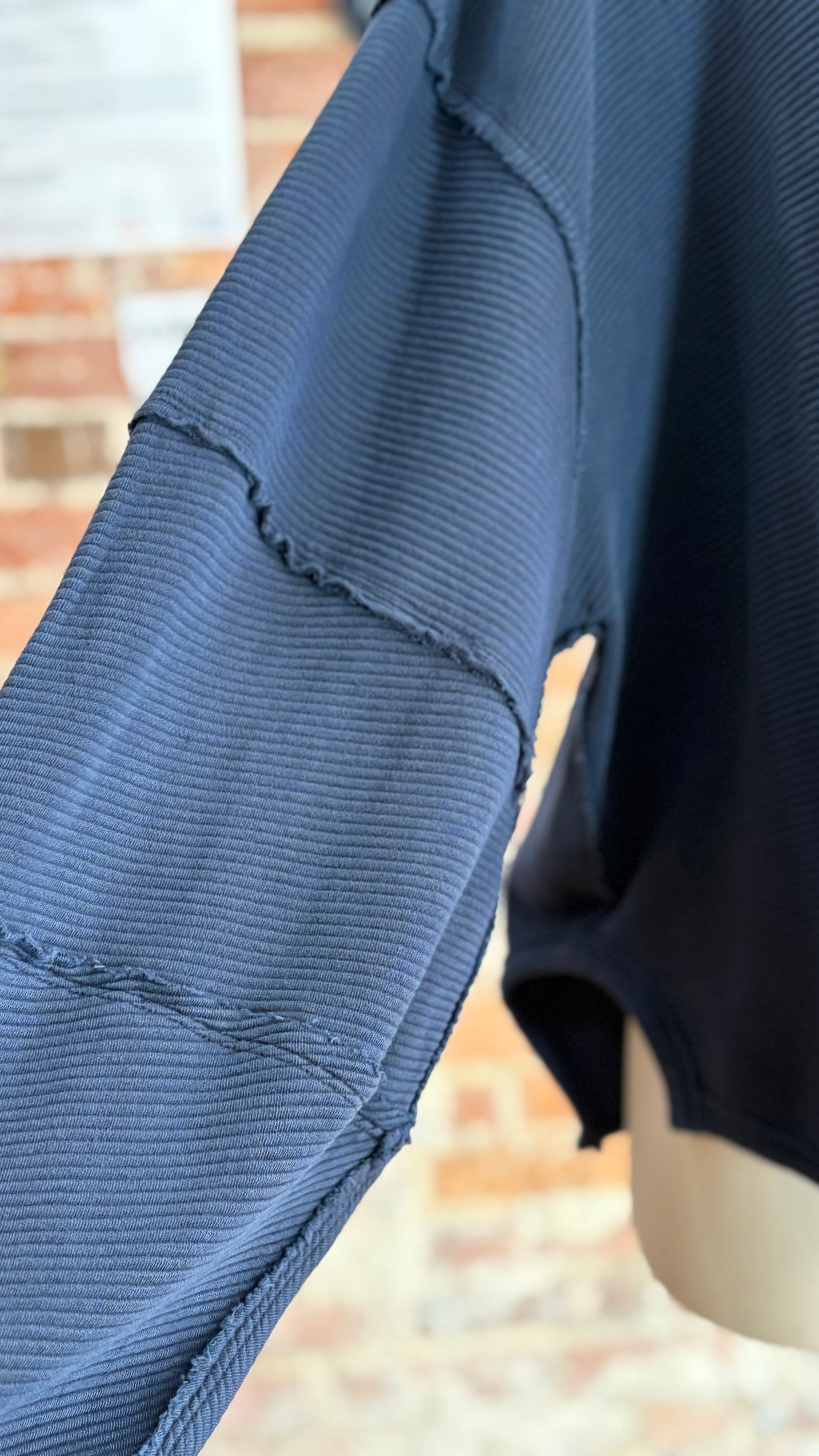 Features: Ribbed fabrication, scoop-neckline, drop-shoulder sleeves with cuffs, defined seam detailing with raw trim