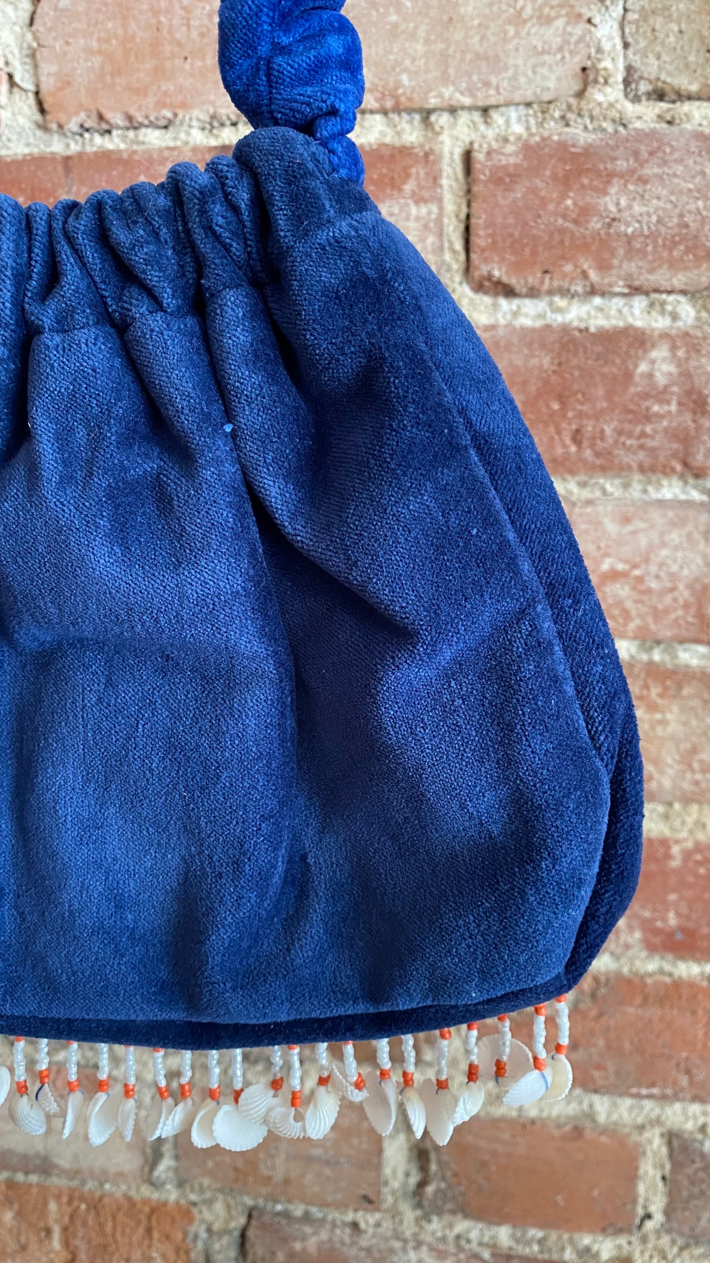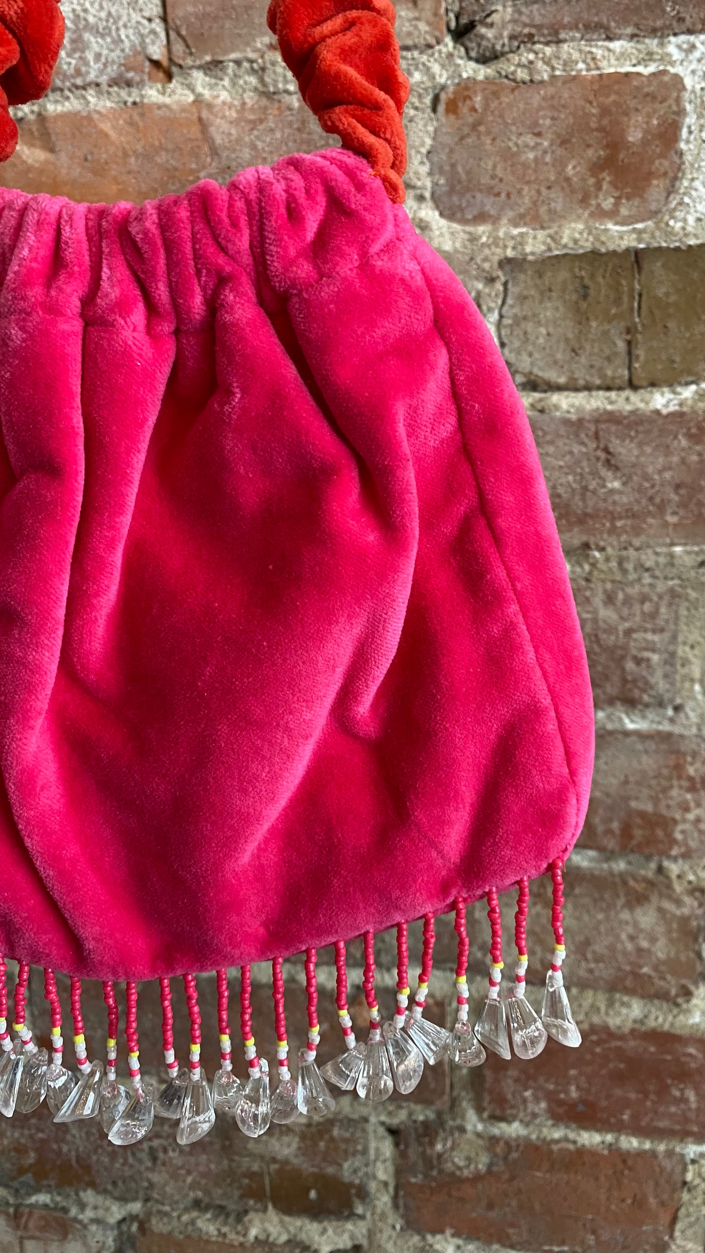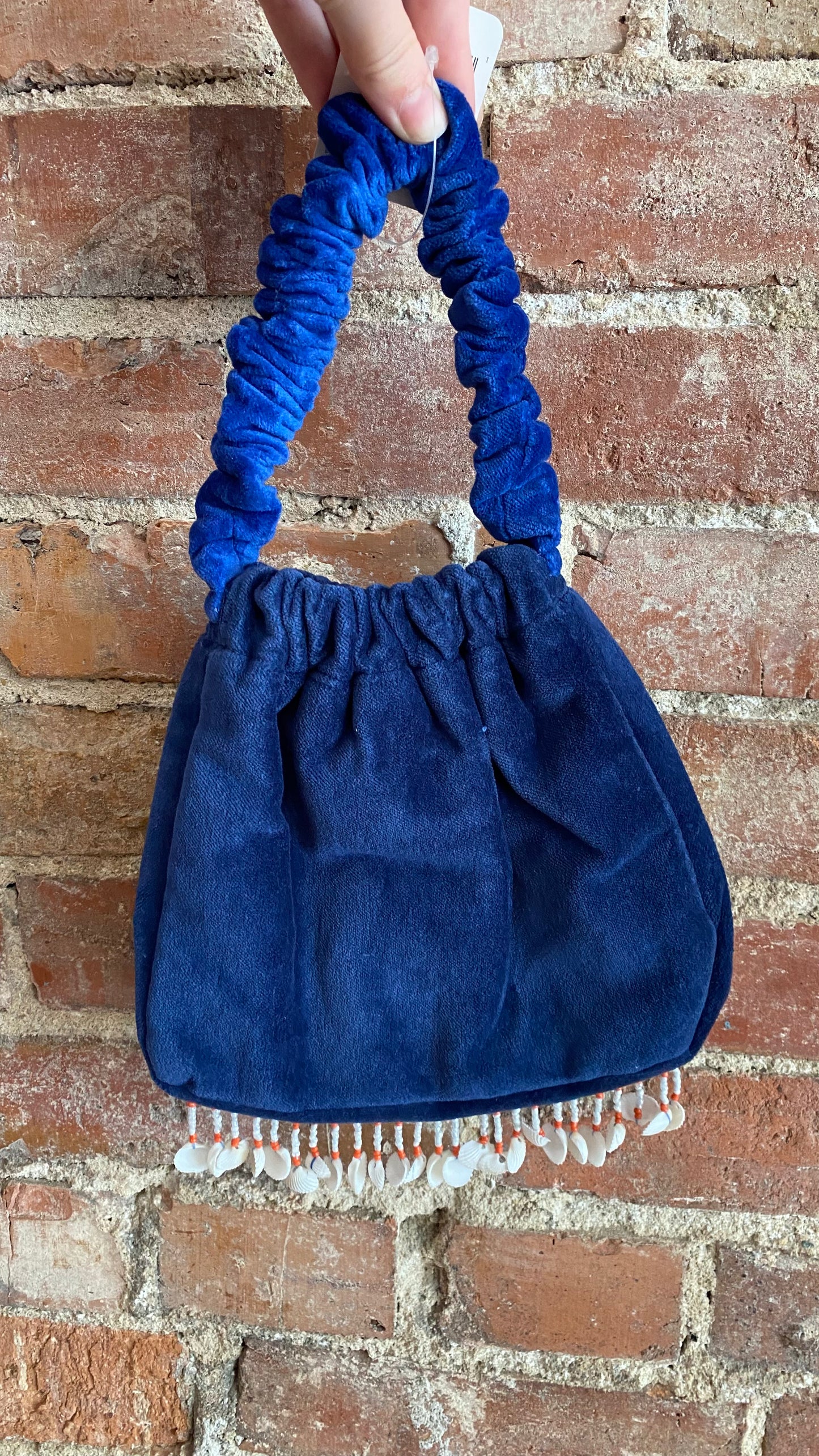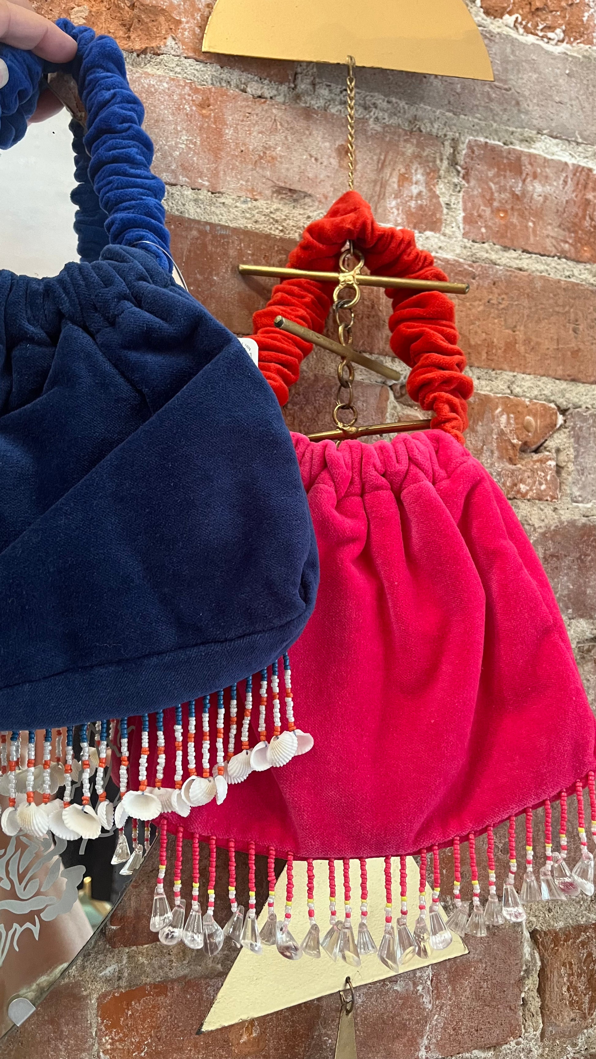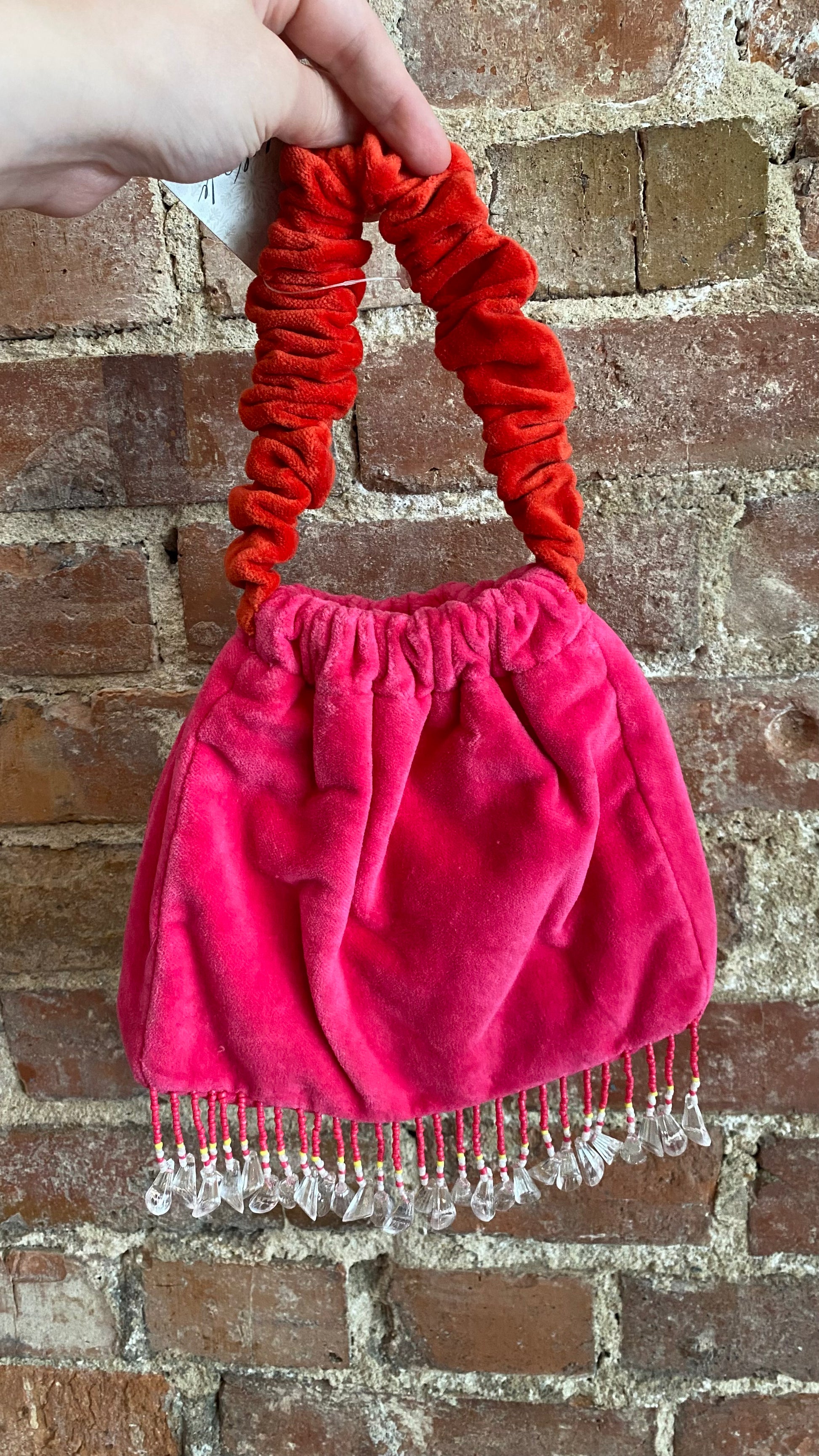 Features: Clutch style, scrunched top opening, beaded fringe at bottom